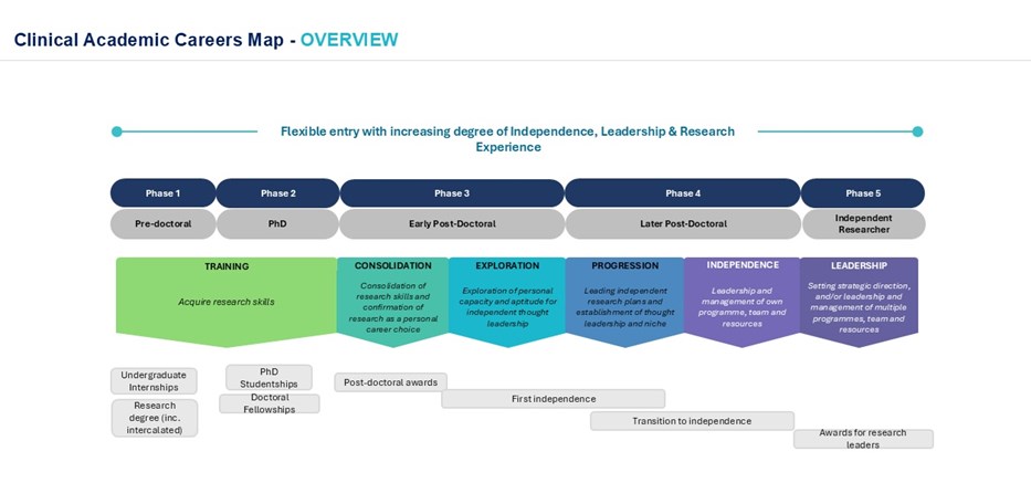A simplified framework has been established with agreement on five defined career phases. The framework outlines the types of fellowships or personal awards which may be offered at each career stage, aiming to allow flexible entry with increasing degree of research experience, independence, leadership. The purpose of which is to provide clinical researchers at any level of seniority with visibility of the funding pathway in the UK.